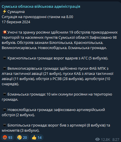 По данным Сумской ОВА за минувшие сутки, "осуществлены пуски ФАБ МПК с самолета тактической авиации (21 взрыв), пуски КАБ с самолета тактической авиации (11 взрывов), обстрел из РСЗО (28 взрывов), артобстрел (10 снарядов)".