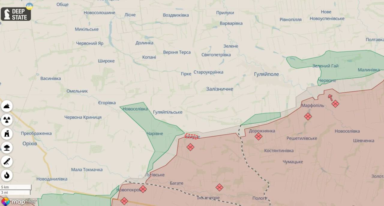Также минобороны РФ утверждает, что российская армия захватила село Мирное в Запорожской области. Украина этого не подтверждала. На карте DeepState село указано как серая зона. На картах российских военных пабликов оно значится как захваченное армией РФ.