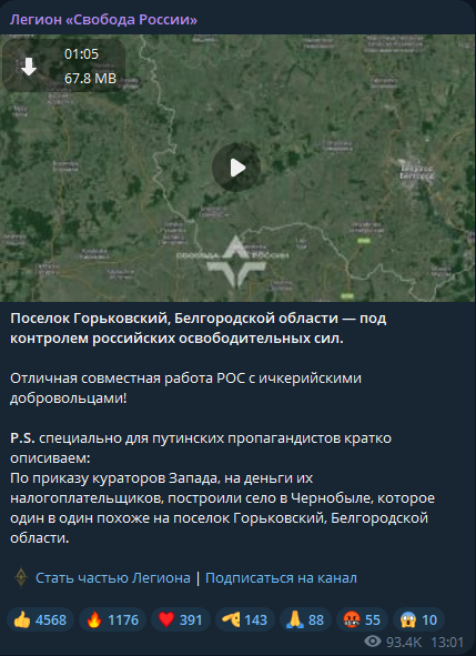 Российский добровольческий легион "Свобода России" заявляет, что "вместе с ичкерийскими добровольцами" взяли под контроль поселок Горьковский Белгородской области.