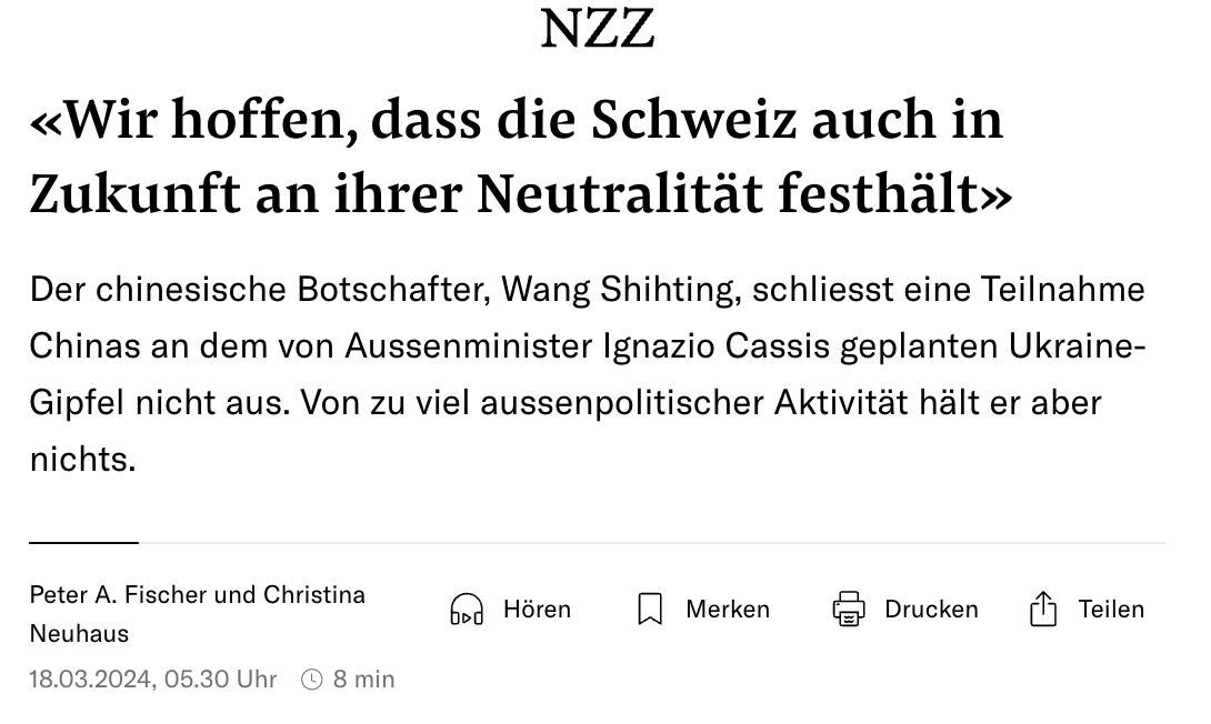 "Китай выступает за продвижение мирных переговоров и всегда был привержен этому. И мы также представили стратегию политического прекращения конфликта: необходимо уважать территориальный суверенитет всех стран и соблюдать Устав ООН. Кроме того, все стороны должны работать над прекращением войны. Мы должны не допустить, чтобы кризис усугубился или даже вышел из-под контроля. Мы внимательно следим за украинской конференцией, которую примет Швейцария, и рассматриваем возможность участия", - сказал китайский посол в Швейцарии.