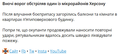 В Херсоне во время ночного российского обстрела загорелась пятиэтажка