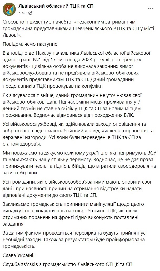 В ТЦК заявили, что он не выполнил требования военнослужащих и не предъявил военно-учетные документы представителям ТЦК и СП, также сообщается, что он "провоцировал конфликт".