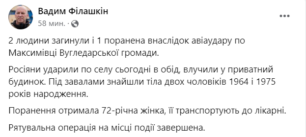 "Россияне ударили по селу сегодня в обед, попали в частный дом. Под завалами нашли тела двух мужчин 1964 и 1975 годов рождения", -написал он.