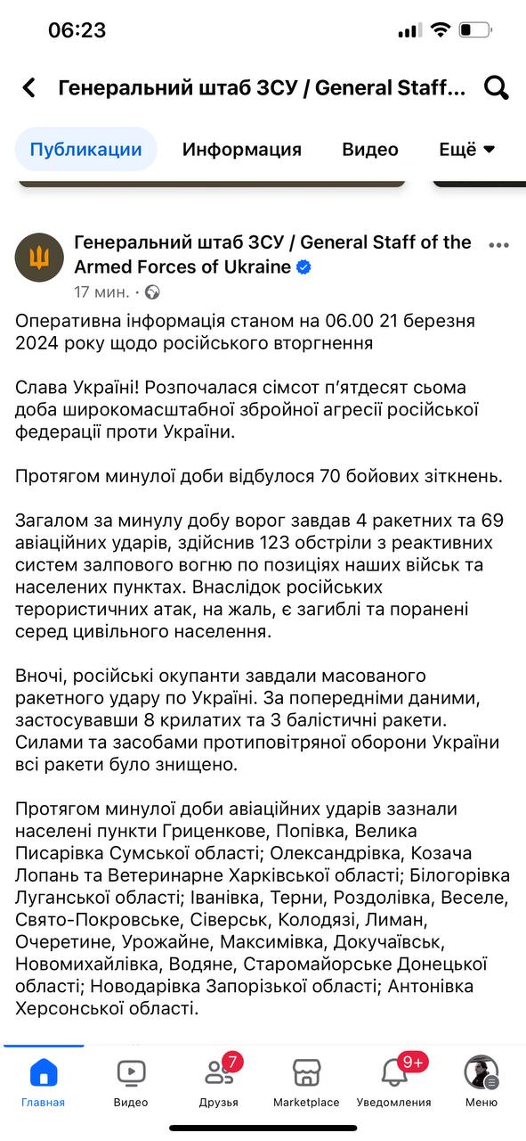 07.39 Командующий Воздушными силами ВСУ Николай Олещук заявляет, что россияне запустили этой ночью по Украину 31 ракету (2 баллистичных и 29 крылатых) и и все они были сбиты.