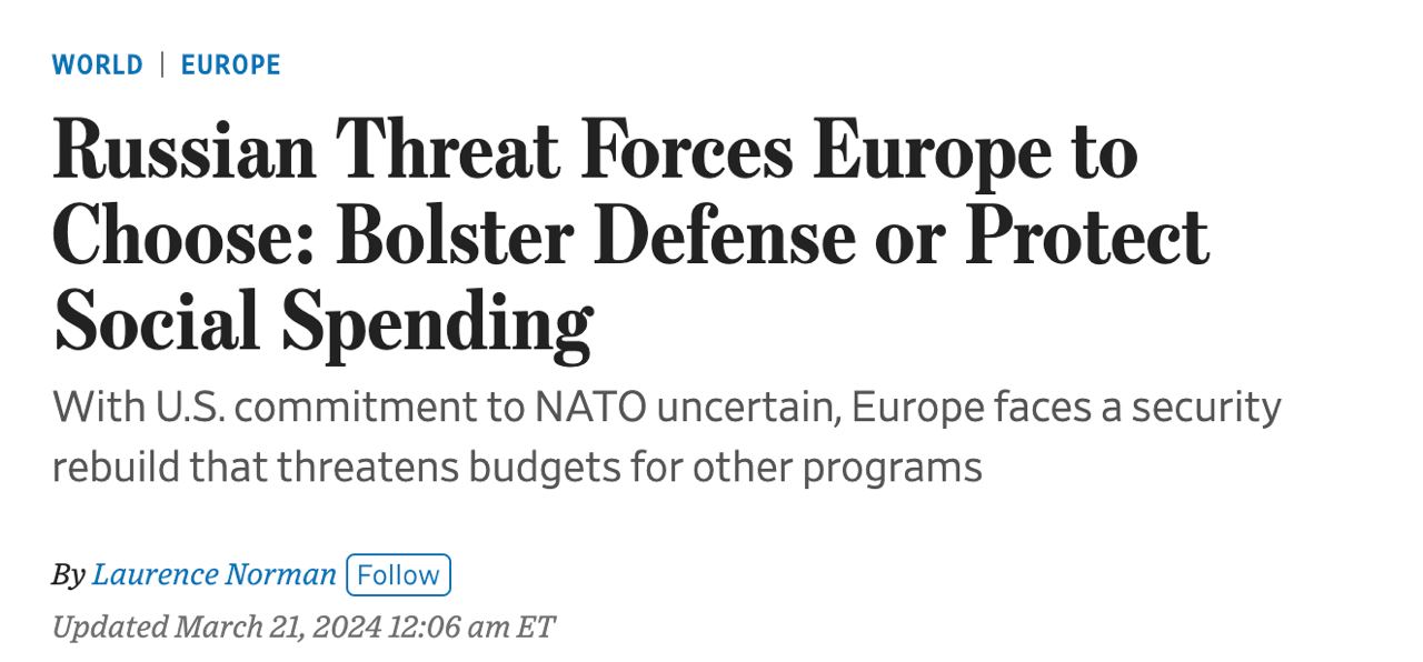 НАТО тем временем истощил свои собственные запасы оружия для поддержки Украины. А создание в Европе надежной обороны для защиты от возможного вторжения РФ, особенно учитывая угрозу невмешательства Штатов, поставит под угрозу нынешнюю социальную модель Евросоюза.