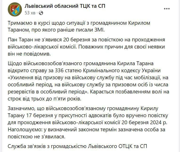 ТЦК заявляет, что он не явился 20 марта по повестке на прохождение военно-врачебной комиссии. Уважительных причин при этом не сообщил.