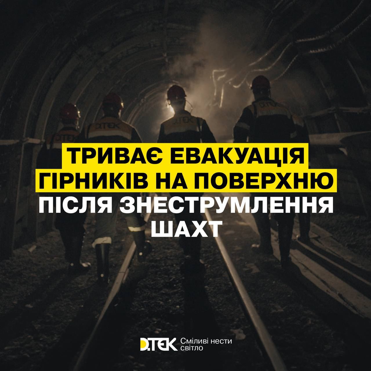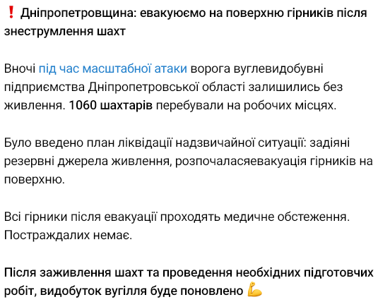 "Ночью во время масштабной атаки врага угледобывающие предприятия Днепропетровской области остались без питания. 1 060 шахтеров находились на рабочих местах. Был введен план ликвидации чрезвычайной ситуации: задействованы резервные источники питания, началась эвакуация горняков на поверхность. Все горняки после эвакуации проходят медицинское обследование. Пострадавших нет", - говорится в сообщении.