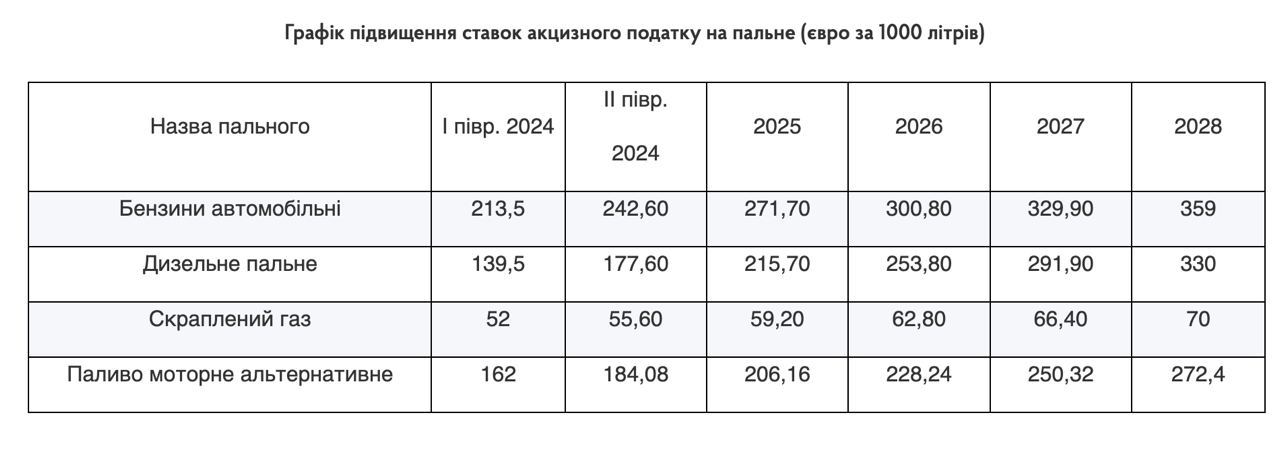 Акциз на бензин увеличится с 213,5 грн в первом полугодии 2024 до 242,60 - во втором и постепенно до 359 грн в 2028 году.