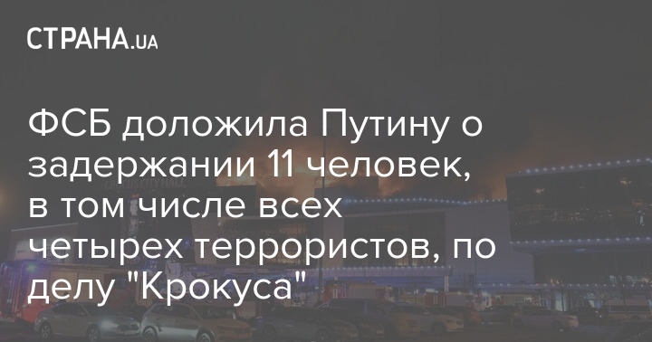 "Глава ФСБ доложил Путину о задержании 11 человек, в том числе всех четырех террористов, непосредственно участвовавших в теракте в Крокусе" - говорится в сообщении.