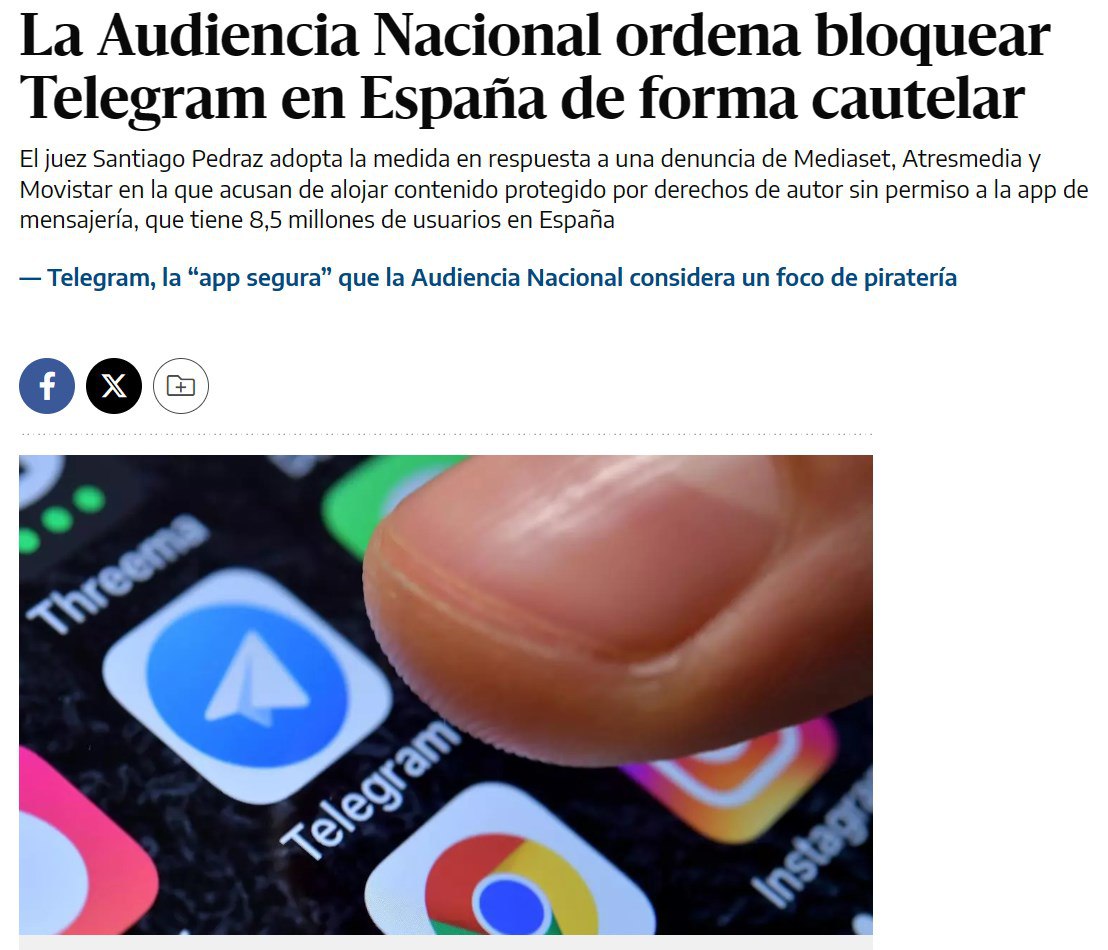На мессенджер пожаловались медиаплатформы, которые заявили, что Telegram незаконно размещает у себя их контент. Судья удовлетворил их иск после того, как мессенджер не ответил на запрос испанской фемиды.