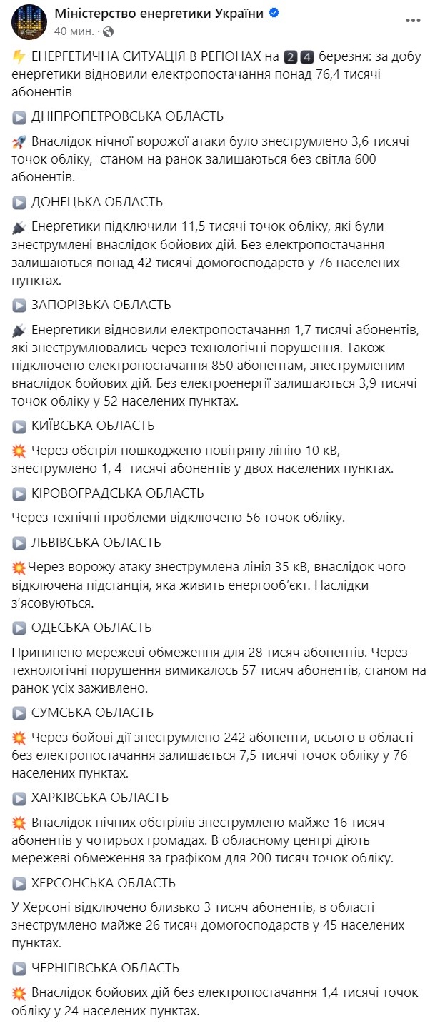 10:59 В Харькове после российского удара 22 марта перебои со светом остаются у 200 тысяч абонентов, сообщает Минэнерго.