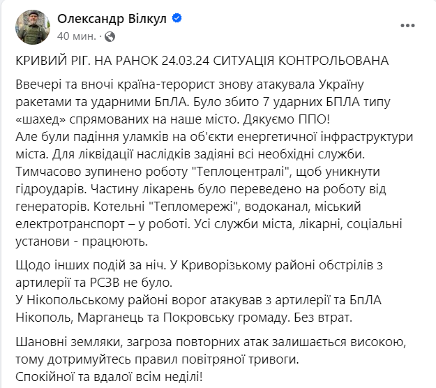 Сегодня ночью в Кривом Роге обломки "Шахедов" упали на объекты энергетической инфраструктуры. Об этом сообщил глава Криворожской городской военной администрации Александр Вилкул.