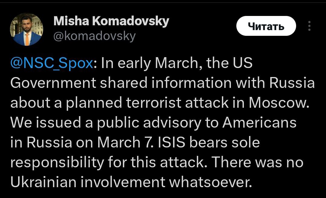 США заявляют, что украинского следа в теракте под Москвой нет. Украина также отрицала свою причастность к произошедшему.