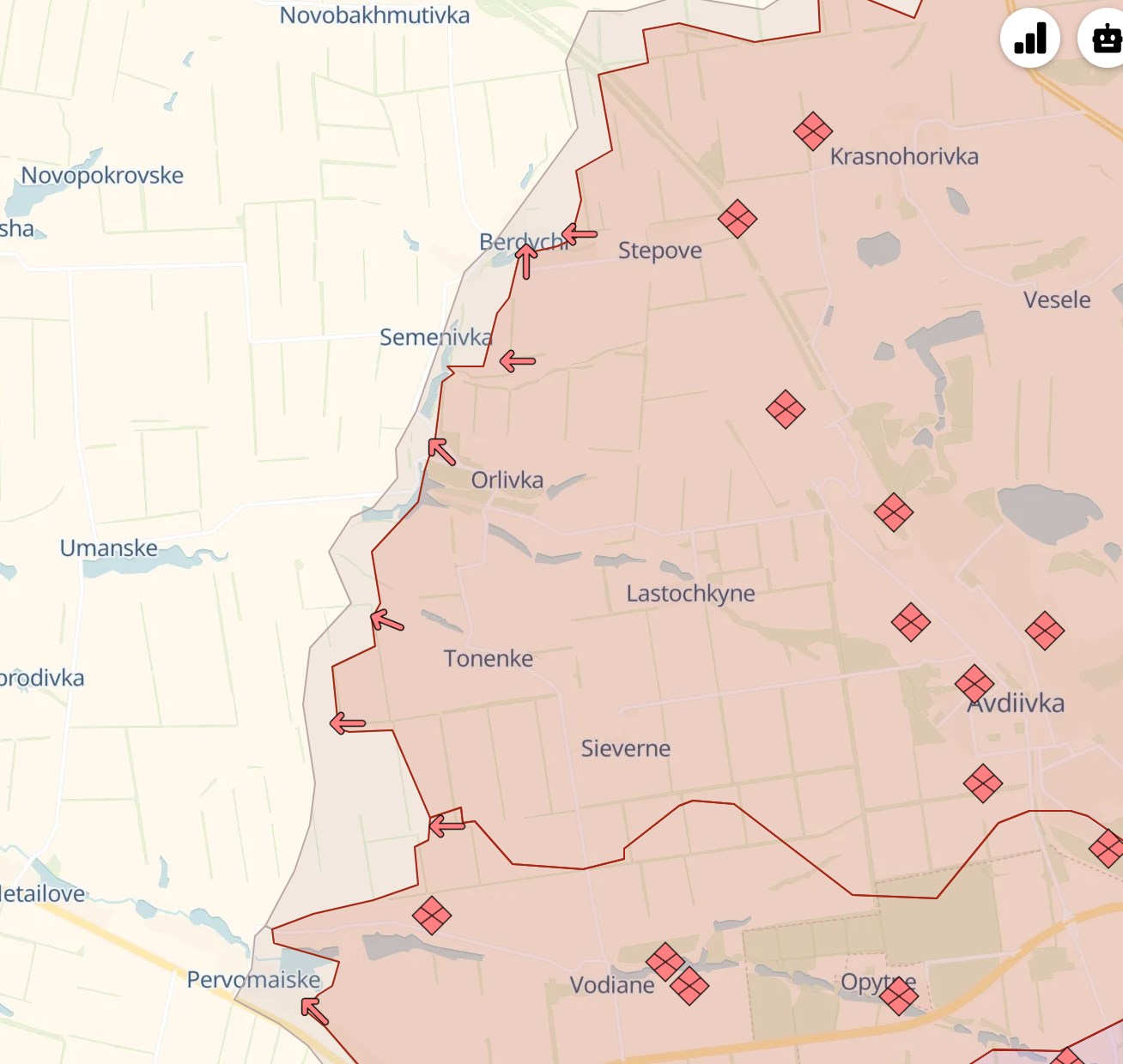 Институт изучения войны пишет, что российские войска продвинулись южнее Бердычей к западу от Тоненького. По данным Deep State, под Тоненьким "ситуация существенно ухудшилась". Движение со стороны Тоненького создает угрозу для находящегося южнее Первомайского.