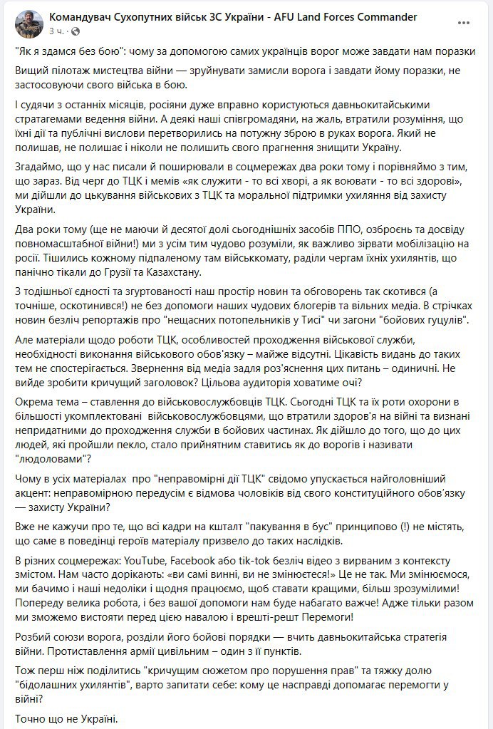 Командующий Сухопутными войсками заявил о "травле" сотрудников ТЦК в Украине