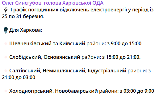 Глава Харьковской областной военной администрации Олег Синегубов опубликовал график почасовых отключений электроэнергии для Харькова и области. Расписание вступит в силу в понедельник, 25 марта и будет действовать неделю, до 31 марта.