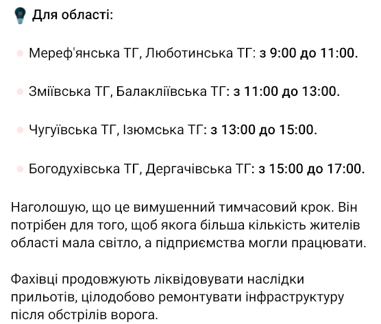 Синегубов добавил, что введение почасового графика отключений - вынужденная временная мера, которая нужна для того, чтобы большее количество жителей области были с электричеством, а предприятия могли работать.