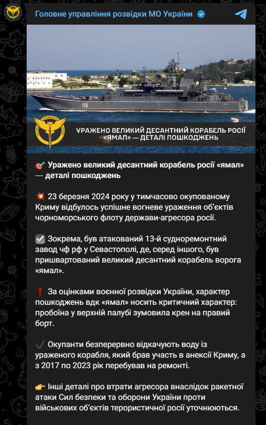 ГУР заявляет, что большой десантный корабль "Ямал" в Севастополе получил критические повреждения во время ракетного удара 23 марта.