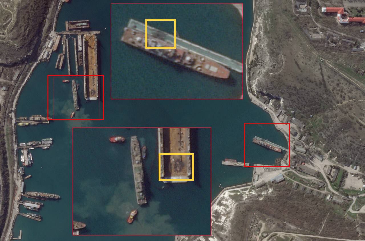 Ряд пабликов со ссылкой на спутниковые снимки заявляют, что прилеты двух ракет были в пирс рядом с десантными кораблями и в пустой док. То есть корабли не пострадали.