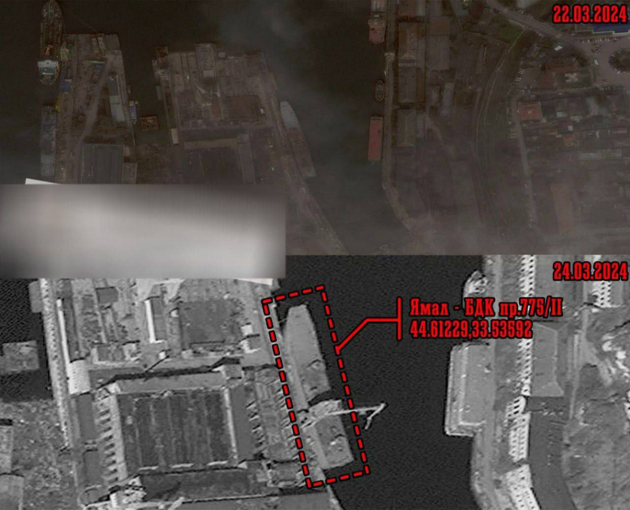 Утверждается, что прилет был по судоремонтному заводу, где был пришвартован "Ямал". Корабль, по версии украинской разведки, получил пробоину в верхней палубе и дал крен на правый борт. Теперь оттуда откачивают воду.