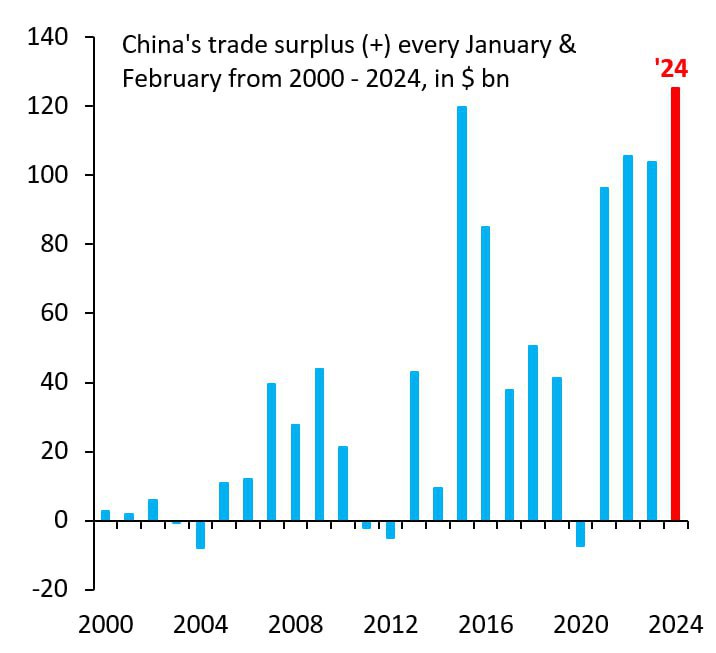 Профицит торгового баланса Китая за первые два месяца 2024 года стал самым большим за всю историю.
