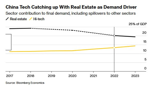 Также Bloomberg пишет, что высокотехнологичный сектор Китая стимулирует растущий спрос на товары и услуги в экономике, и к 2026 году его вклад в совокупный спрос может сравняться с недвижимостью.