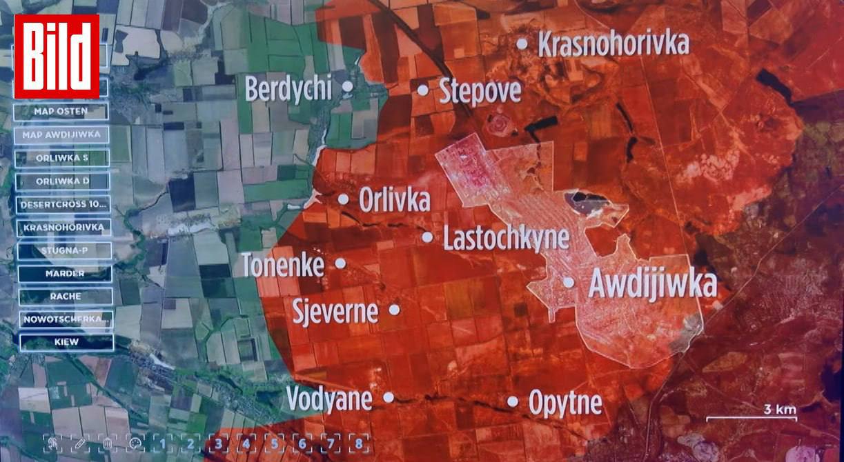 Ранее Рёпке сообщал, что ВСУ с трудом держат оборону на линии Бердычи - Семёновка - Орловка - Тоненькое западнее Авдеевки, рубеж обороны постепенно смещался на запад. Теперь, по данным аналитика, Тоненькое и Орловка полностью захвачены российскими войсками. Бои продолжаются лишь за Бердычи.