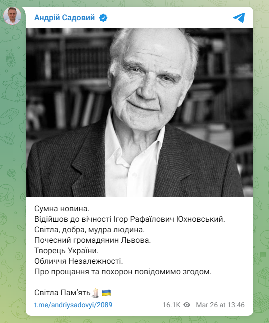 "Грустная новость. Отошел в вечность Игорь Рафаилович Юхновский", - написал мэр, добавив, что политик был почетным гражданином Львова, одним из творцов Украины и лицом независимости.