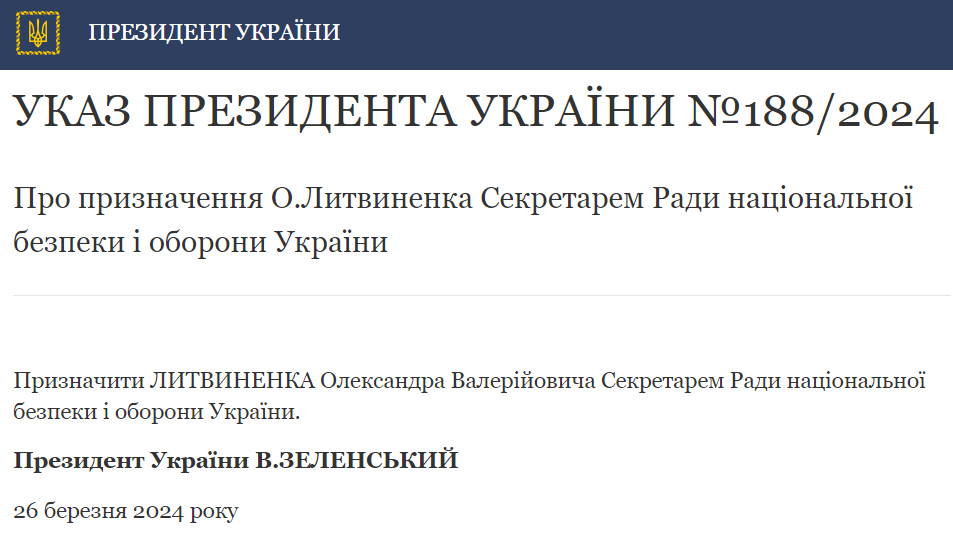 "Назначить Литвиненко Александра Валерьевича секретарем Совета национальной безопасности и обороны Украины", – говорится в указе №188/2024.