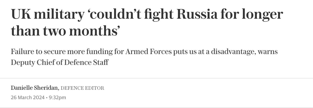 Заместитель главы штаба обороны королевства Роб Магован заявил, что британские военные "не смогут воевать с Россией дольше двух месяцев".