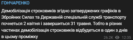 Демобилизация срочников начнется 2 апреля и завершится 31 мая. Об этом сообщает народный депутат Алексей Гончаренко со ссылкой на утвержденные графики ВСУ и Госспецслужбы транспорта.