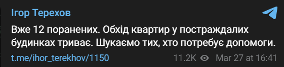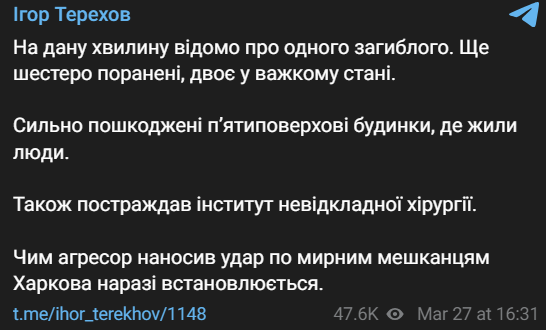 "Сильно повреждены пятиэтажные дома, где жили люди. Также пострадал институт неотложной хирургии", - написал он.