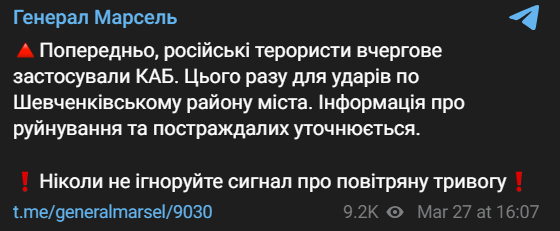 Между тем командующий украинскими войсками в Харьковской области генерал Сергей Мельник ("Марсель") сообщил, что по Шевченковскому району Харькова наносился удар КАБами.