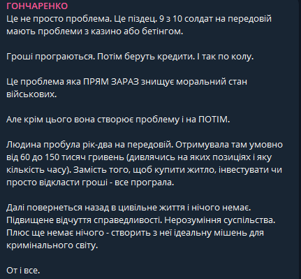 "Деньги проигрываются. Потом берут кредиты. И так по кругу. Это проблема которая прямо сейчас уничтожает моральное состояние военных. Но кроме этого она создает проблему и на потом. Человек пробыл год-два на передовой. Получал там условно от 60 до 150 тысяч гривен. Вместо того, чтобы купить жилье, инвестировать или просто отложить деньги - все проиграл. Далее вернется обратно в гражданскую жизнь и ничего нет. Повышенное чувство справедливости. Непонимание общества. Плюс еще нет ничего - создаст из него идеальную мишень для криминального мира", - пишет Гончаренко.