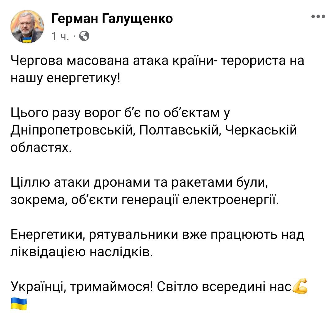 "В этот раз враг бьет по объектам в Днепропетровской, Полтавской, Черкасской областях", - написал Галущенко