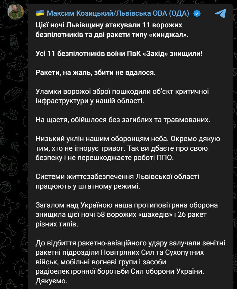 В свою очередь пуск ракеты по региону подтверждал и глава Львовской областной военной администрации Максим Козицкий.