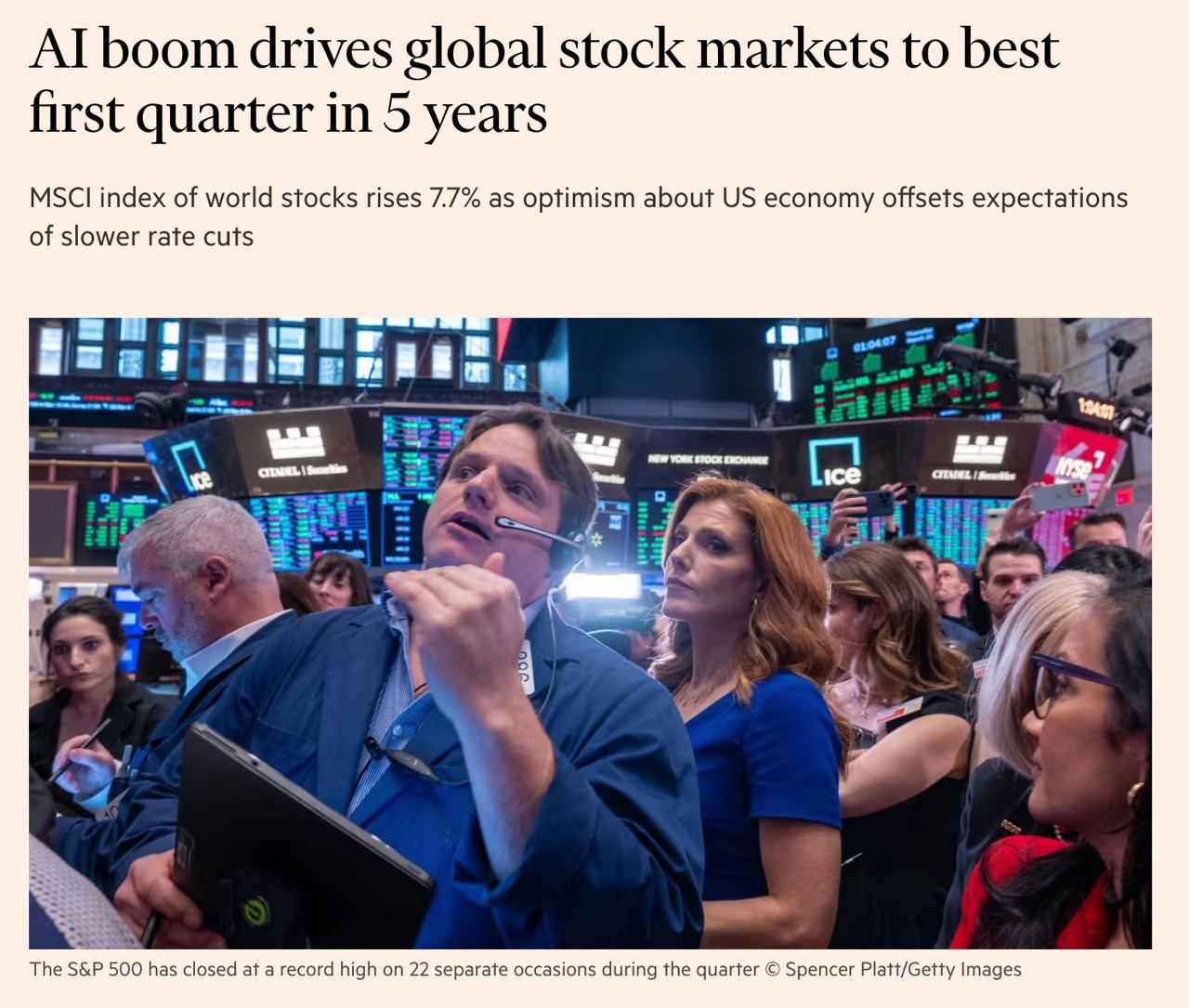 Бум искусственного интеллекта привел мировые фондовые рынки к лучшему первому кварталу за последние пять лет. Индекс мировых акций MSCI вырос на 7,7%, что является максимальным показателем с 2019 года.