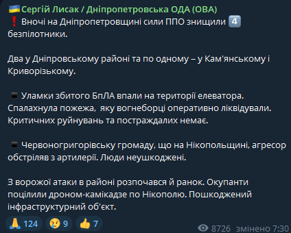 Глава Днепропетровской ОВА Сергей Лысак заявил, что в Днепропетровской области обломки сбитого беспилотника упали на территории элеватора. Критических разрушений и пострадавших нет. Вспыхнул пожар.