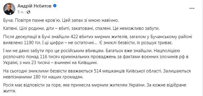 "На сегодняшний день пропавшими без вести считаются 514 жителей Киевской области. Остаются неопознанными 180 тел наших граждан", - написал Небытов.