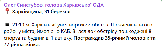 08:36 Губернатор Синегубов подтвердил, что по Харькову вчера вечером наносился удар корректируемой авиабомбой (КАБ).