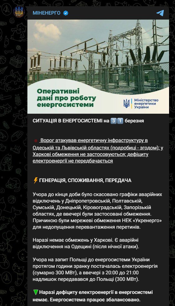 09:43 Целью ночного удара РФ были высоковольтные подстанции "Укрэнерго" в южном регионе.