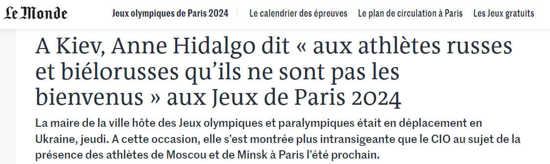 Напомним, еще весной прошлого года мэр Парижа говорила, что если в 2024 году будет продолжаться война, то спортсменов РФ не должно быть на Олимпиаде.