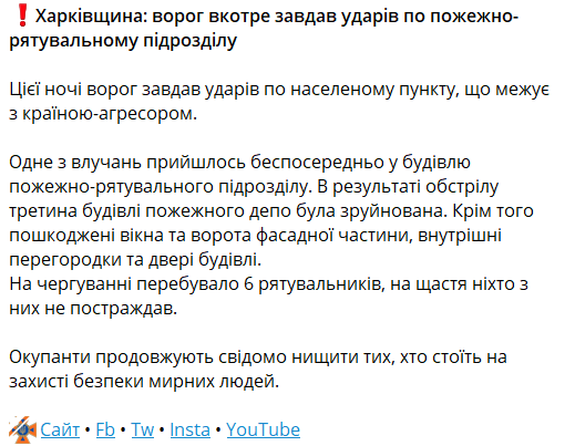 Напомним, в середине марта россияне ударили ракетами по пожарной части в приграничном населенном пункте Харьковской области. Пострадал спасатель.