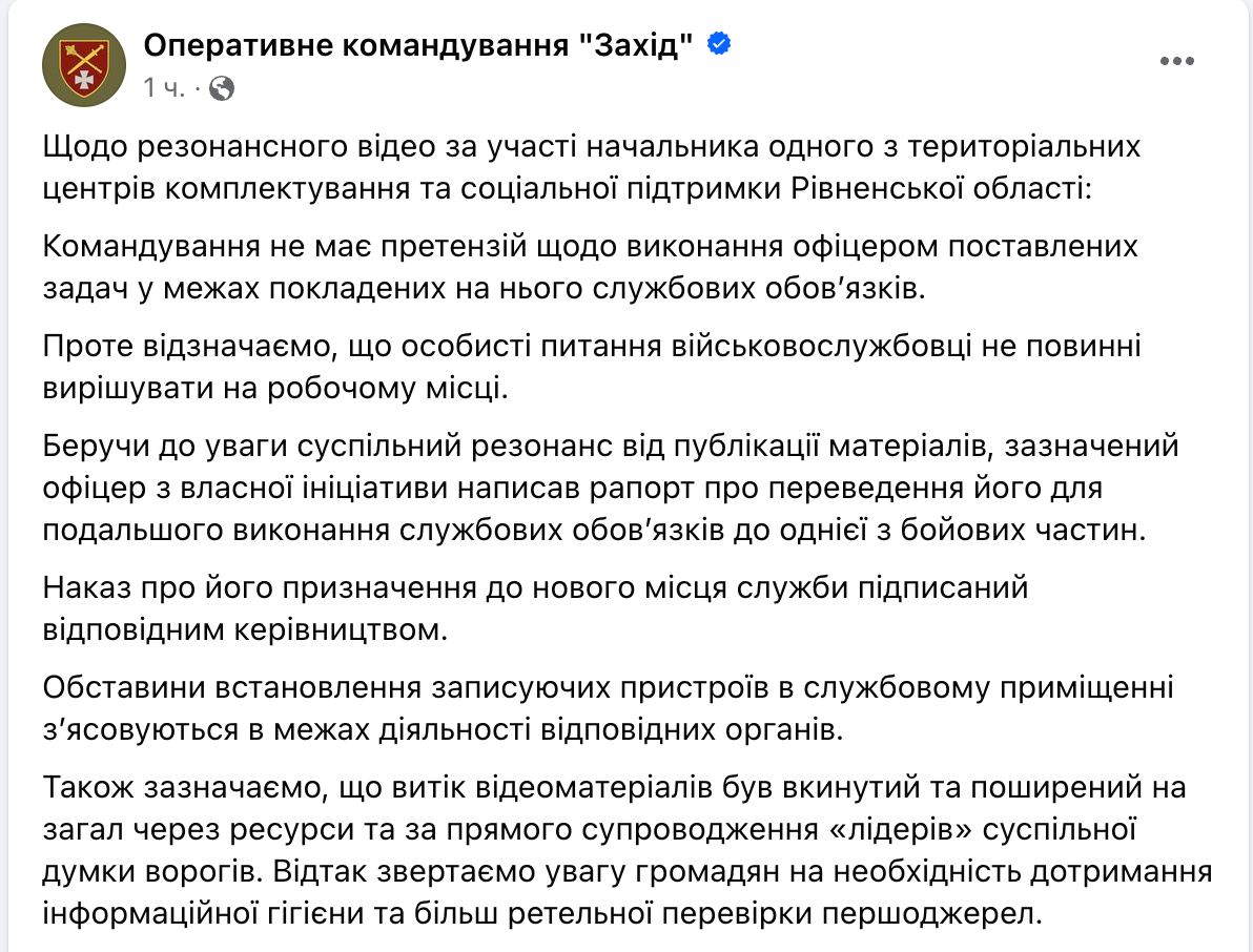 Ровенский военком, который целовался с сотрудницами на рабочем месте, написал рапорт о переводе в боевую часть.