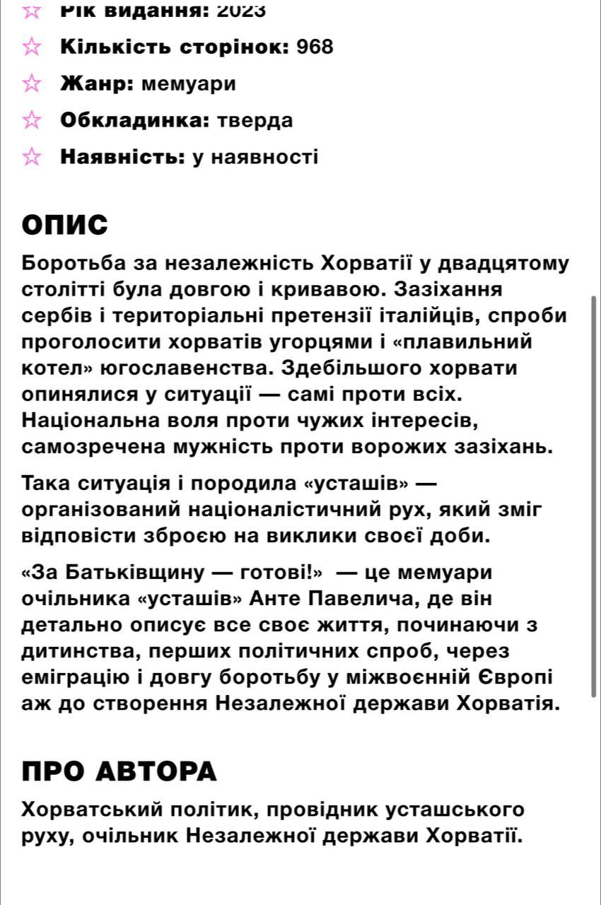 В Украине продаются мемуары хорватского фашиста Анте Павелича. Фото: скриншот