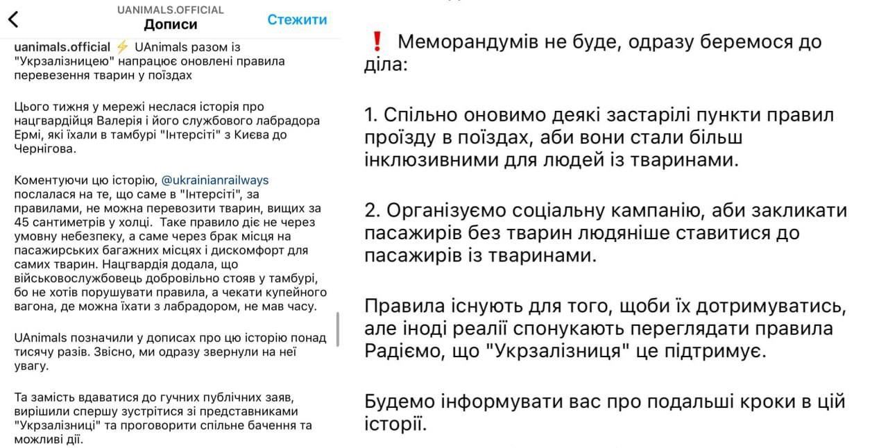После скандала организация по защите животных "Uanimals" заявила, что вместе с "УЗ" работает над обновлением правил перевоза животных в поездах.