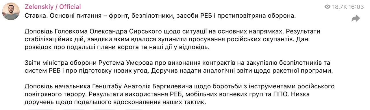 - Сообщил о заседании Ставки, где обсуждалось производство дронов и РЭБ, поставлены задачи и по ракетной программе.