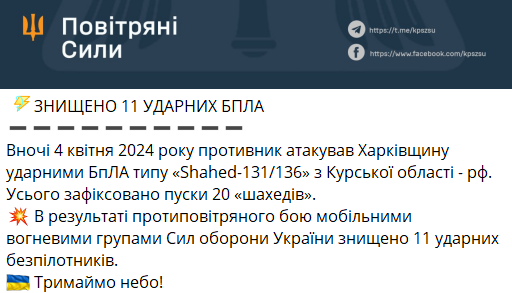 Ночью 4 апреля россияне атаковали Харьковскую область ударными беспилотниками типа Shahed-131/136 из Курской области РФ. Всего зафиксированы пуски 20 дронов, из которых сбито более половины.