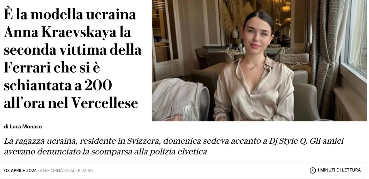 В Италии украинская 21-летняя модель Анна Краевская разбилась насмерть в изготовленном на заказ автомобиле Ferrari GTC4, мчавшем на скорости около 320 км в час.