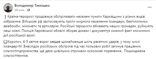"В результате российских обстрелов во время полевых работ погиб работник сельхозпредприятия, еще двое гражданских получили осколочные ранения. Повреждена сельхозтехника", – сообщил он.